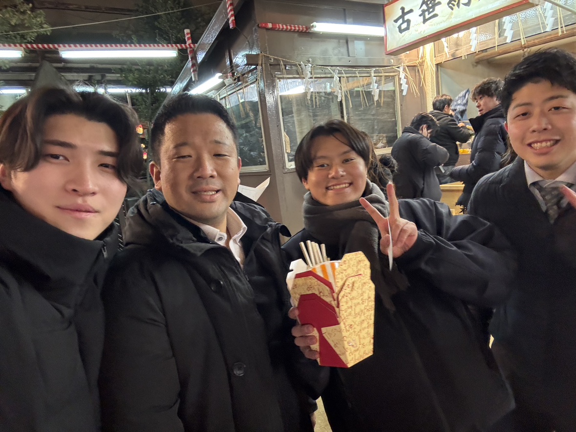これは店舗のメンバーとえべっさんに行った際の写真です。普段は仕事を通してお互いに切磋琢磨しながら高め合える関係ですが、プライベートでは笑い合える、とても良いチームです。こうした関係性が日々の仕事にも良い影響を与えており、明るく前向きに取り組む原動力になっています!!