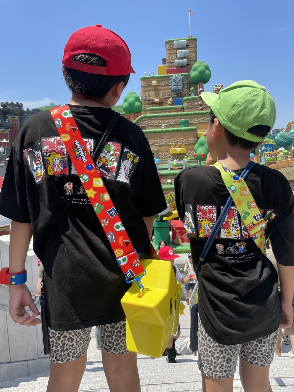 子供たちは任天堂エリアとハリーポッターエリアが特にお気に入りで、夏はマリオとルイージの帽子を、冬はハリーポッターのローブを羽織って、全力で世界観を楽しんでいます。